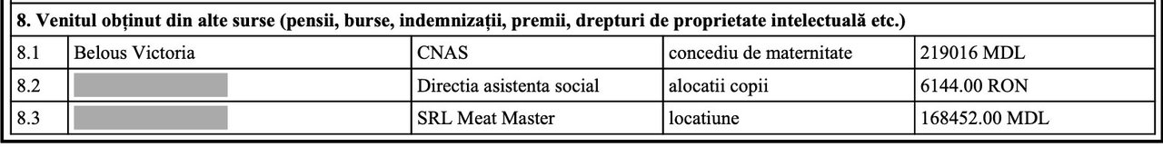 Potrivit declarației de avere pentru 2023, de exemplu, aceasta a ridicat doar de la CNAS peste 200 de mii de lei drept concediu de maternitate și salarii și onorarii de un milion de lei de la FISC.