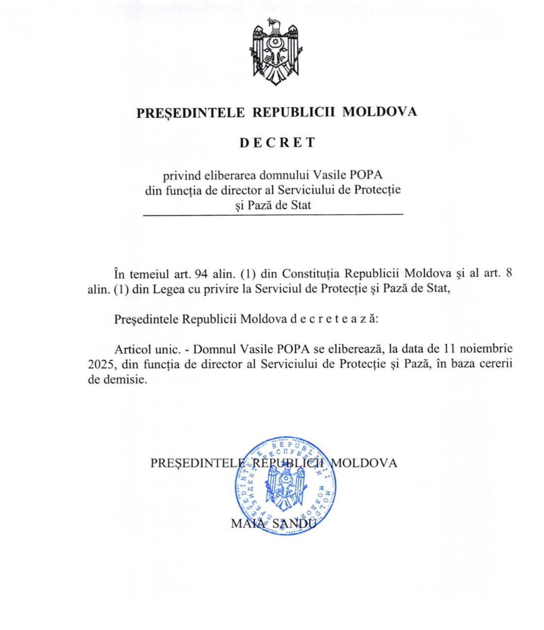 Președinta Maia Sandu a demnat cererile de demisie a șefului Serviciului de Protecție și Pază de Stat (SPPS), Vasile Popa, și a unuia dintre adjuncți – Vitalie Lupașcu. Informația a fost confirmată pentru Realitatea.md de consilierul prezidențial Igor Zaharov.